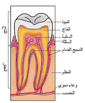 * يتكون تاج السن من طبقتين من الأنسجة الكلسيه وهي المينا والعاج واللتان تغطيان لب السن المحتوي على عصب وأوعية دموية. وقد تصبح الأسنان حساسة عندما تبدأ الطبقة الخارجية وهي المينا بالتآكل مسببة انكشاف المنطقة القريبة من عصب السن معرضة السن الى تأثره بالعوامل الخارجية مثل أي مؤثر حار أو بارد.